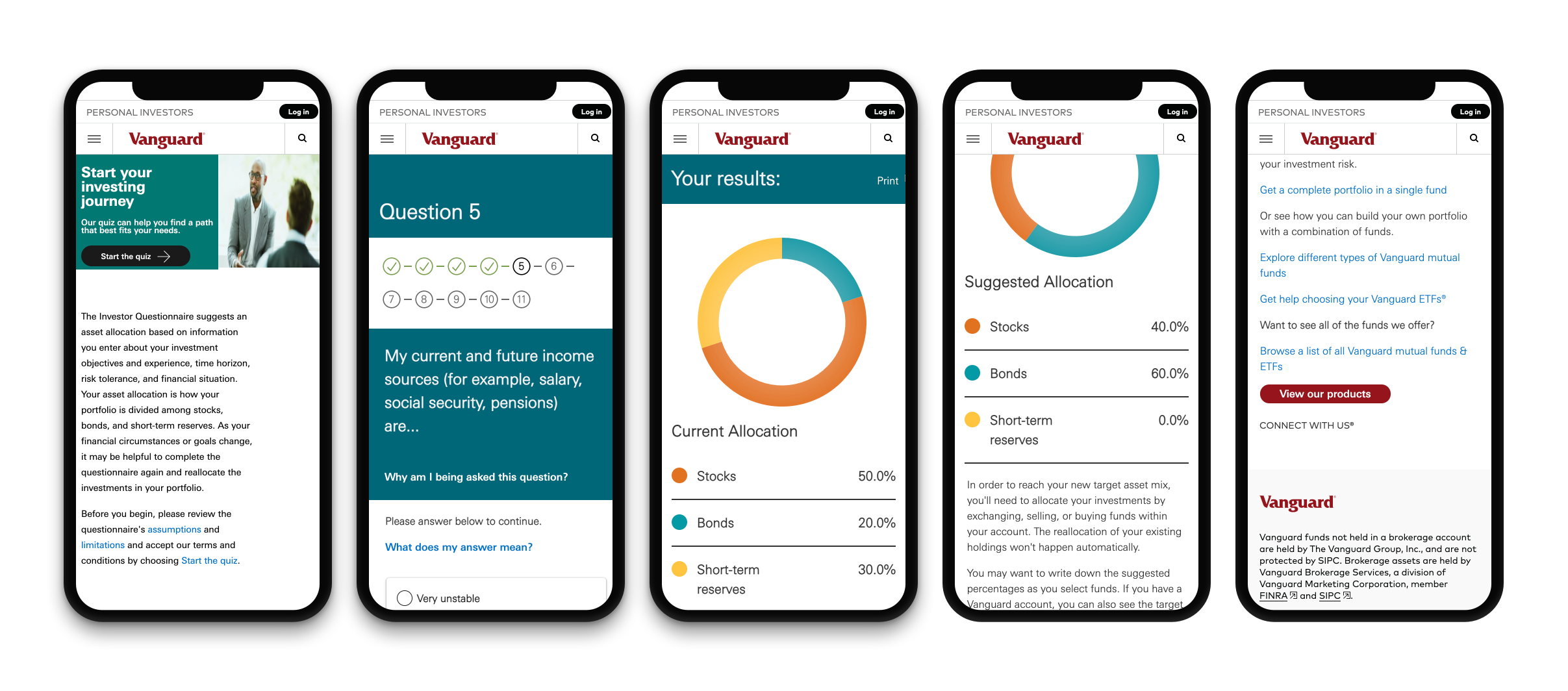 I conducted a competitive analysis of existing quizzes and took those learnings to improve Vanguard’s quiz. I halved the number of clicks required by users, showed their progress as they completed questions, optimized the layout for mobile audiences, and improved typographic hierarchies on the results page.